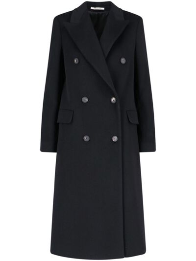 black cashmere double-breasted button fastening peak lapels long sleeves buttoned cuffs two side flap pockets central rear vent straight hem