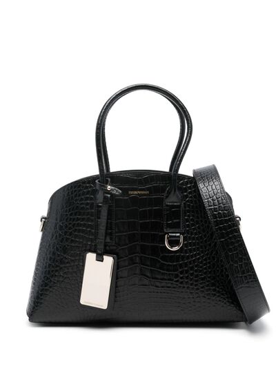 black faux leather embossed crocodile effect open top two rolled top handles adjustable detachable shoulder strap logo charm D-ring findings logo stamp to the front main compartment removable pouch