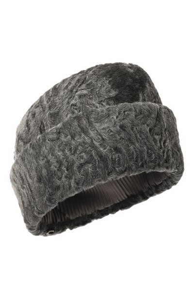 Для пошива шапки-москвички мастера марки использовали шелковистую каракульчу с муаровым рисунком, который никогда не повторяется. Благодаря ему и ярко выраженному глянцевому блеску материала серый оттенок аксессуара получился многограннее и глубже.