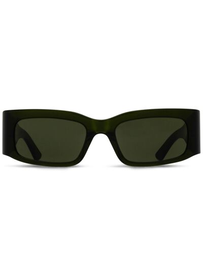 dark green recycled acetate matte finish logo print at the arm oversize arms tinted lenses These glasses come with a protective case.