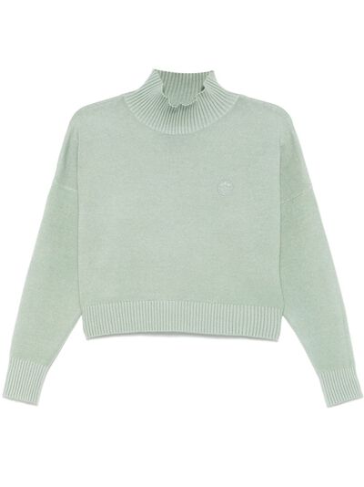 light green fine knit ribbed trim high neck drop shoulder long sleeves ribbed cuffs embroidered logo at the chest ribbed hem