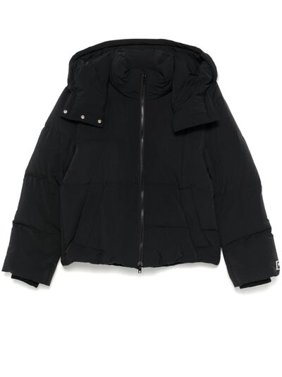 black duck down padded design quilted front two-way zip fastening funnel neck detachable hood long sleeves rubberised logo detail ribbed cuffs full lining internal zip-fastening pocket internal elasticated toggle detailing straight hem