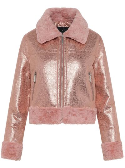 rose pink metallic finish faux-shearling trim front zip fastening long sleeves front zip fastening pockets straight hem
