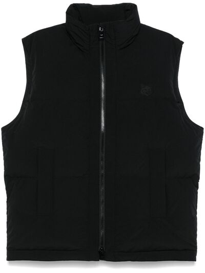 black down-feather filling padded design front two-way zip fastening high neck sleeveless signature fox motif at the chest two side slit pockets drawstring straight hem