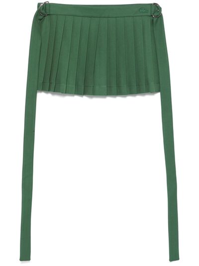 grass green virgin wool blend twill weave fully pleated adjustable sliding fastening loose straps logo patch to the front open sides unlined straight hem thigh-length