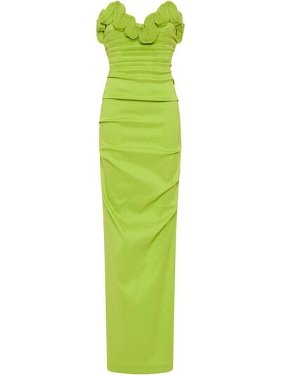 lime green draped design rear zip fastening strapless sweetheart neck appliqué detailing fitted waistline rear slit floor-length