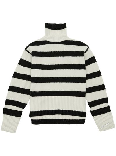 white/black merino wool knitted construction horizontal stripe pattern roll neck long sleeves logo patch at the sleeve ribbed cuffs and hem