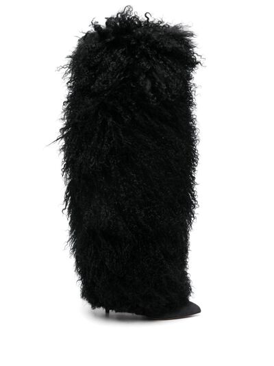 black Mongolian fur pull-on style knee-length high stiletto heel pointed toe branded leather insole rubber sole