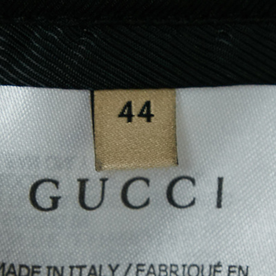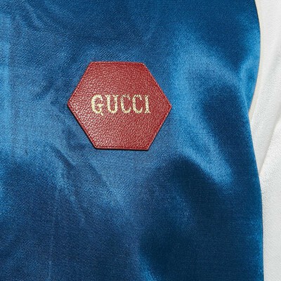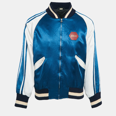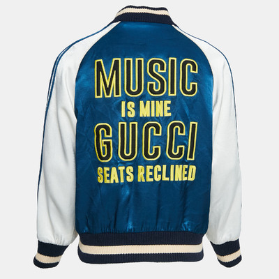 If you have an eye for fun clothing then this jacket by Gucci will surely impress. Adopt a contemporary style with satisfaction through this blue creation made from satin. It features zip closure, music is mine lettering at the back, ribbed trims at the hem and cuff.