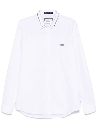 white cotton poplin texture front button fastening classic collar spike stud detailing logo plaque long sleeves buttoned cuffs curved hem