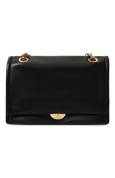Сумку VLogo сшили из гладкой телячьей кожи. Ремень-цепочку с наплечником украсили вставкой в виде одноименной эмблемы. Под откидным клапаном с магнитной кнопкой — отделение с карманом на молнии. Еще один карман разместили на задней панели.