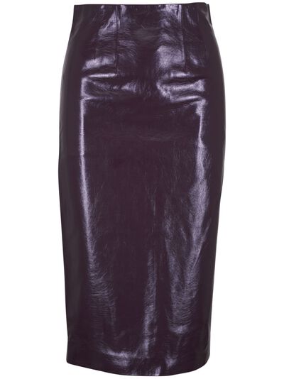 plum purple patent finish pencil silhouette rear zip fastening rear slit dart detailing straight hem