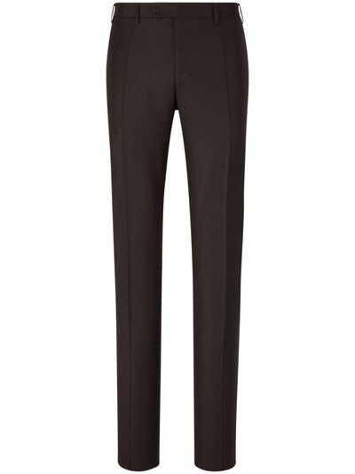 coffee brown wool felted concealed front fastening mid-rise belt loops pressed crease two side slit pockets two rear button-fastening jetted pockets tailored cut