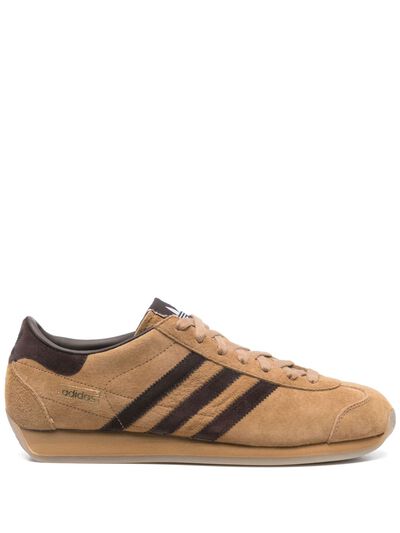 light brown calf suede colour-block panelled design front lace-up fastening contrasting branded heel counter padded ankle logo print to the side signature trefoil logo patch at the tongue signature 3-Stripes logo round toe removable insole partial lining EVA midsole striped rubber sole