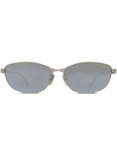 silver-tone metal logo print at the arm oval frame nose pads straight arms grey tinted lenses These glasses come with a protective case.