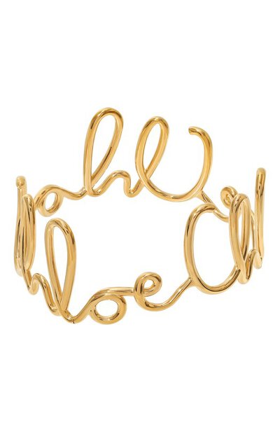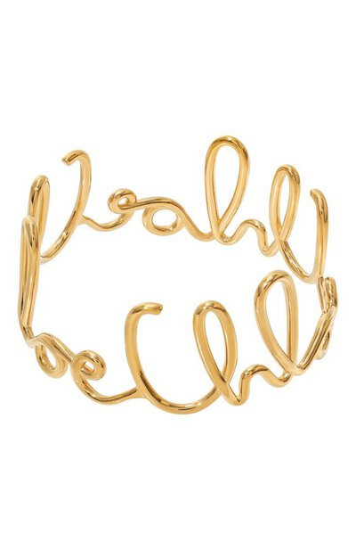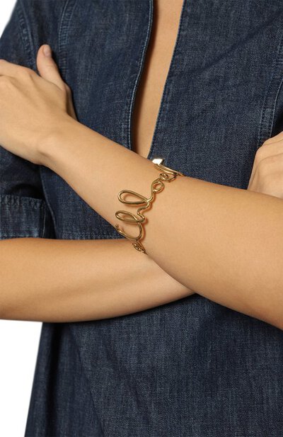 В форме жесткого нерегулируемого браслета угадывается повторяющийся логотип бренда. Для изготовления ажурного аксессуара использовали полированную латунь цвета античного золота.
