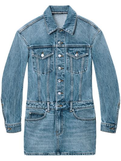 light blue washed denim whiskering effect drop shoulder front button fastening contrast stitching spread collar long sleeves buttoned cuffs two chest flap pockets belt loops classic five pockets straight hem thigh-length