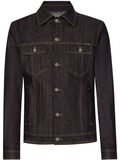 dark grey stretch-cotton denim contrast stitching silver-tone hardware spread collar front button fastening long sleeves buttoned cuffs two chest flap pockets two side welt pockets straight hem