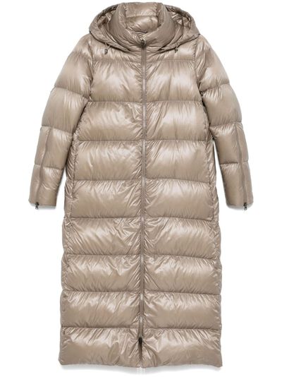 light brown goose down padded design quilted front zip fastening high neck detachable drawstring hood long sleeves cuff zips two side inset pockets full lining straight hem