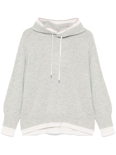 heather grey merino wool-cashmere blend knitted construction mélange effect pointelle trim contrasting border layered details drawstring hood long raglan sleeves ribbed cuffs and hem