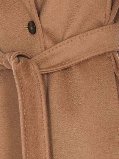 camel brown virgin wool concealed front button fastening classic collar belted waist two side inset pockets long sleeves straight hem