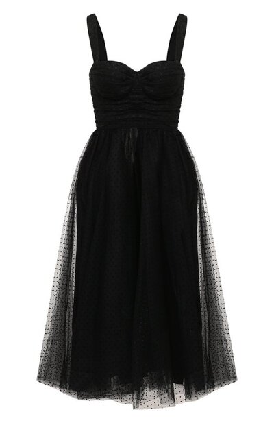 Приталенное платье-бюстье с широким регулируемыми бретелями сшили из полупрозрачного тюля в горох. Модель с многослойным подолом и драпировкой на облегающем лифе застегивается молнией сзади.