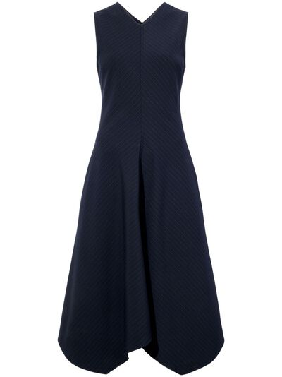 ink blue crepe texture concealed rear zip fastening V-neck check pattern sleeveless A-line skirt handkerchief hem mid-calf length