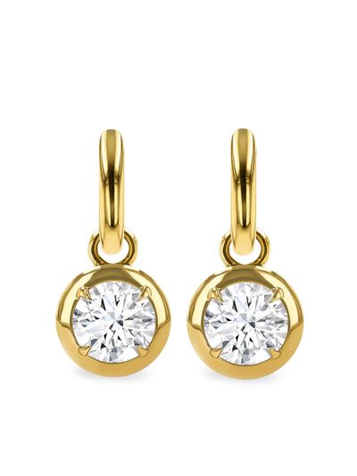 18kt yellow gold F colour VS1 clarity 2ct white diamonds bezel setting small hoop design hook fastening drop design for pierced ears These earrings come as a pair. Normal everyday use and external agents may reduce the lustre of gemstones and gold surfaces. To maintain, use specific, non-abrasive products specially meant for cleaning jewellery.
