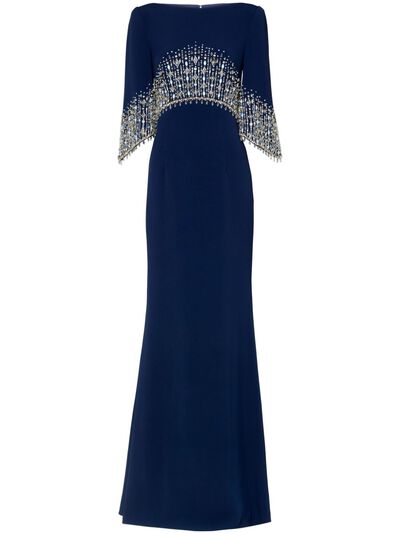 midnight blue crepe texture round neck bead detailing three-quarter length sleeves concealed rear zip fastening maxi satin lining