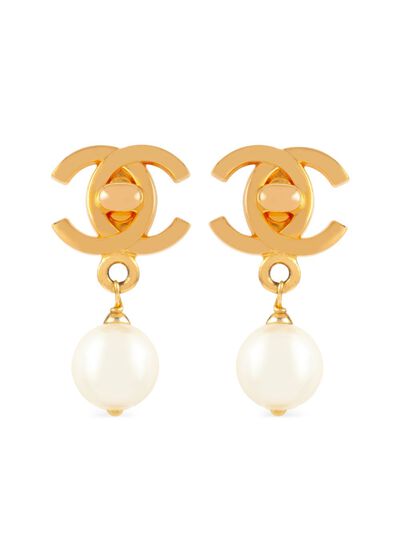 circa 1996 gold plated polished finish signature interlocking CC turn-lock fastening dangle design faux-pearl detailing clip-on design These earrings come as a pair.