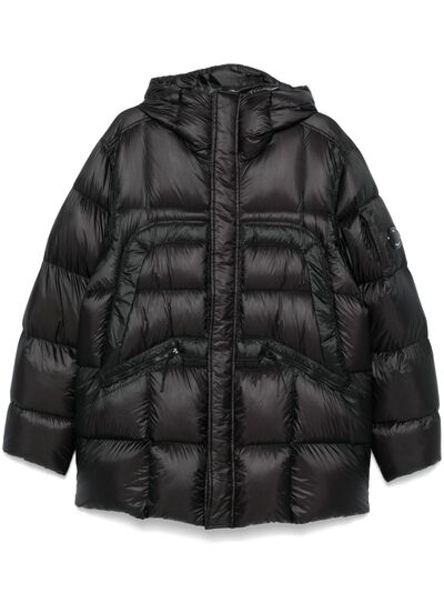black down-feather filling ripstop texture quilted lightweight construction front press-stud and zip fastening classic hood high neck long sleeves signature Lens detail sleeve zip pocket elasticated cuffs multiple zip-fastening pockets internal drawstring fastening waist full lining drawstring hem authenticity QR code C.P. Company suggests removing any detachable accessories before washing.