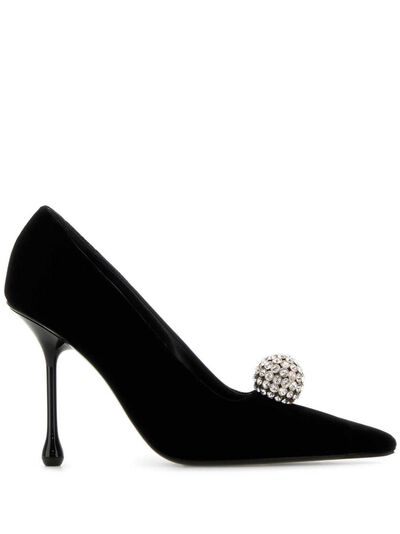 black velvet slip-on style high sculpted heel appliqué detail crystal embellishment pointed toe branded leather insole leather and rubber sole