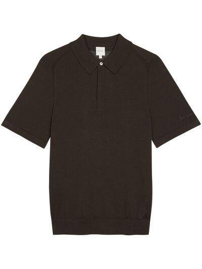 dark brown merino wool fine knit polo collar front button placket short sleeves embroidered logo at the sleeve ribbed hem