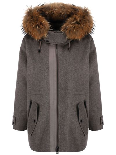 earth brown wool felted mélange effect front two-way zip fastening faux fur-trimmed hood long sleeves belted cuffs two side zip-fastening pockets two side flap pockets mid-length straight hem