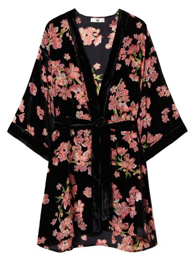 black/multicolour velvet all-over floral print front tie fastening V-neck drop shoulder long wide sleeves belted waist straight hem above-knee length