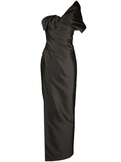 black wool-silk blend concealed rear zip fastening off-shoulder single short sleeve draped detailing gathered detailing boned bodice side slit straight hem full-length
