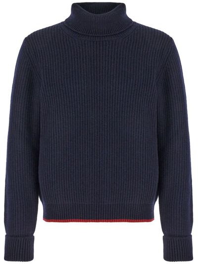 navy blue virgin wool logo patch to the rear roll neck long sleeves straight hem