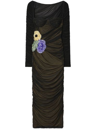 black sequin embellishment ruched bodice concealed side zip fastening sweetheart neck long sleeves straight hem mid-calf length