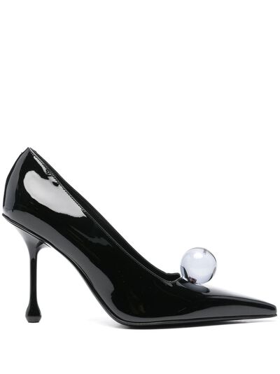 black calf leather patent finish slip-on style 100mm high sculpted heel sphere detail with engraved logo pointed toe branded leather insole leather lining rubber outsole