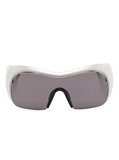 white high-shine finish half-rim design mask frame tinted lenses UV-protective lenses laser-engraved logo at the arm straight arms curved tips nose pads These glasses come with a protective case.