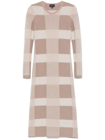 medium beige/light beige virgin wool-cashmere blend knitted construction check pattern crew neck long sleeves unlined straight hem mid-length
