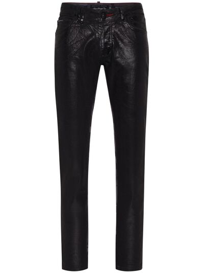 black/grey panelled design coated finish camouflage print logo patch to the rear mid-rise belt loops concealed fly and button fastening classic five pockets skinny cut