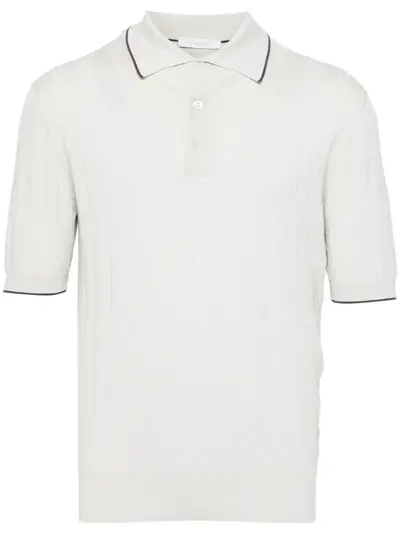 grey cotton knitted construction horizontal stripe pattern front half button fastening contrasting trim spread collar ribbed cuffs and hem