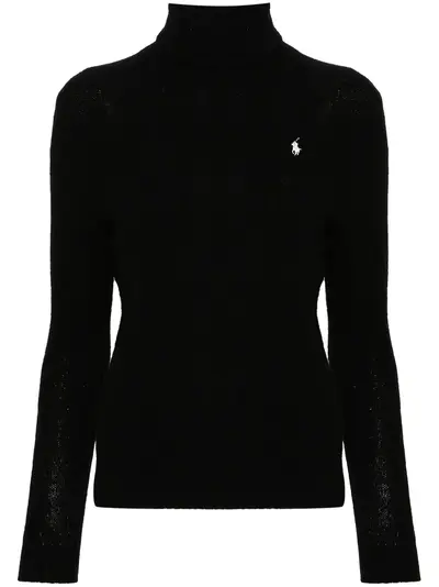 black wool-cashmere blend cable knit roll neck long sleeves ribbed cuffs and hem signature Polo Pony motif embroidery internal logo tag straight hem