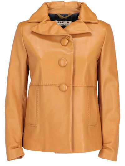 circa 2000s caramel brown leather front button fastening spread collar slip pockets to the sides long sleeves Condition: GOOD. This previously owned and used item is in good condition with minimal signs of use. This may include fading of material or plating and scratches.