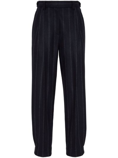 midnight blue virgin wool pinstripe pattern belt loops two side slit pockets decorative button detailing