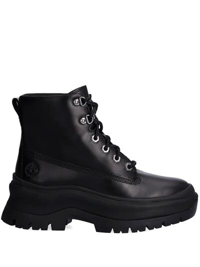 black calf leather smooth grain front lace-up fastening pull-tab at the heel embroidered logo to the side almond toe chunky rubber sole