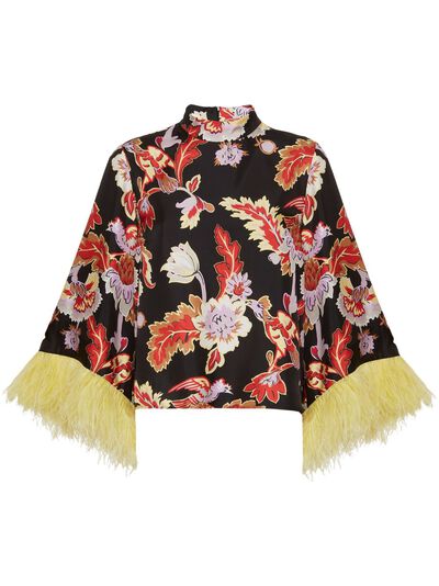 black concealed rear zip fastening all-over floral print feather detailing three-quarter length sleeves