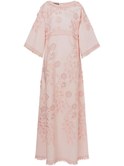 light pink shift style rear button fastening all-over floral embroidery boat neck three-quarter length sleeves maxi