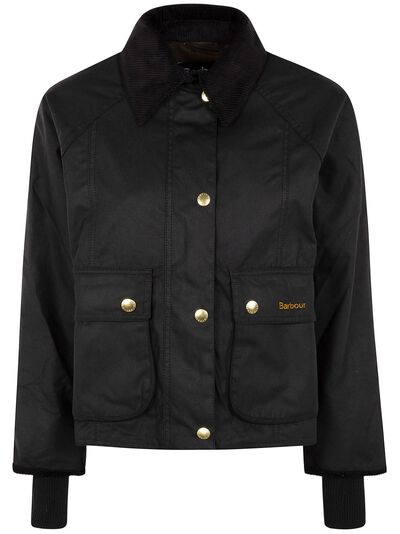 black front press-stud fastening two chest flap pockets ribbed cuffs corduroy collar